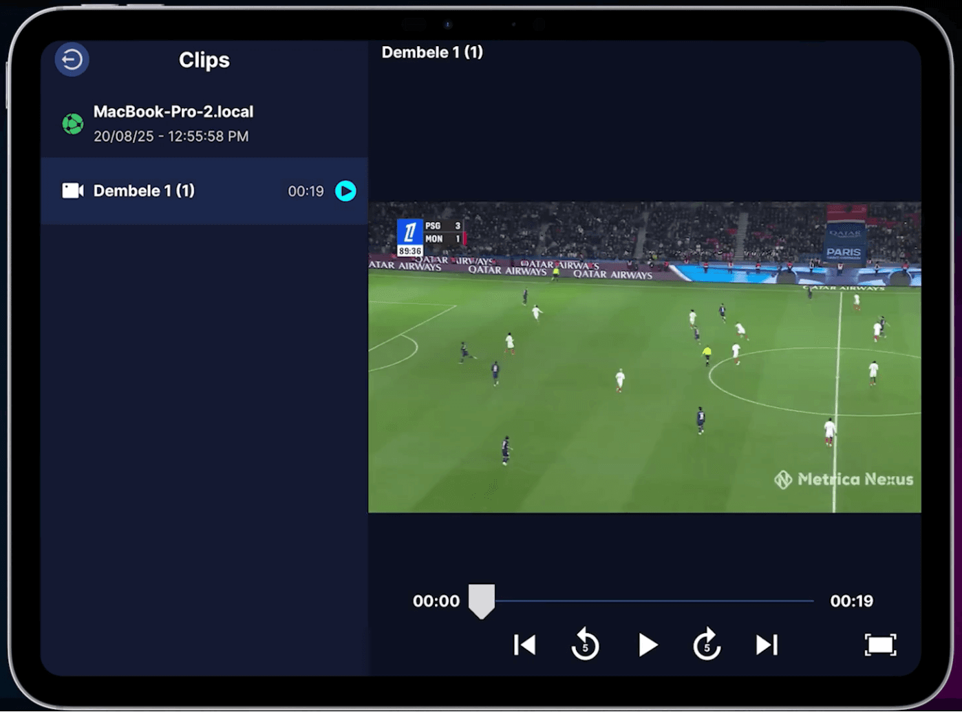 Clip Sharing exports selected clips from Nexus Desktop and sends them to connected mobile devices. The clips can include video only or video with annotations and telestration, depending on the export settings you choose. Once shared, the clips can be viewed instantly on Nexus Mobile with simple playback controls.